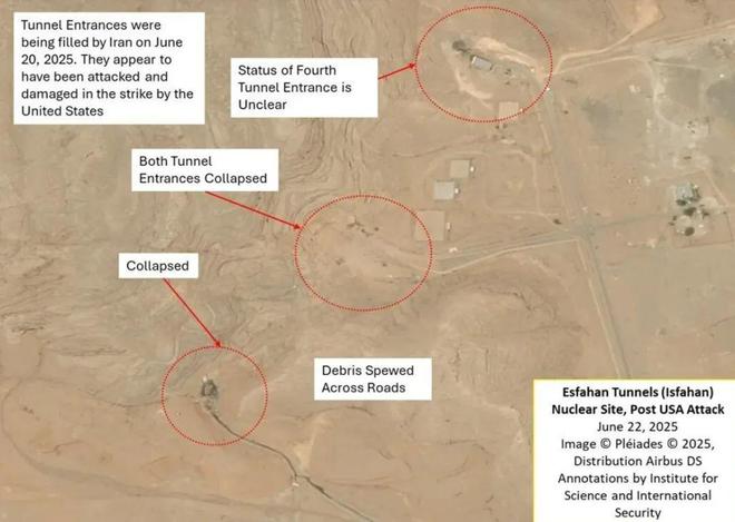 尽管美军宣称“初步作战损害评估表明,所有3个地点都遭受了极其严重的破坏”,但不少美国专家注意到,与遭到GBU-57巨型钻地炸弹攻击的福尔道与纳坦兹核设施不同,伊斯法罕核设施21日并没有美国空军的钻地炸弹落下,而是被美国海军核潜艇发射的“战斧”巡航导弹集中攻击。美国有线电视新闻网(CNN)23日称,根据空中客车公司最新拍摄的卫星照片,在美军导弹袭击之后,照片中可以看到至少18座完全或部分被摧毁的建筑物。美国智库“科学与国际安全研究所”22日发布的评估报告称,伊斯法罕核设施受到了“严重破坏”。其中用于将天然铀矿石转化为含铀化合物的主要铀转化设施“严重受损”。初步报告表明,美军导弹还袭击了伊斯法罕核设施附近的地下隧道综合体,“他们通常在那里储存浓缩铀”。