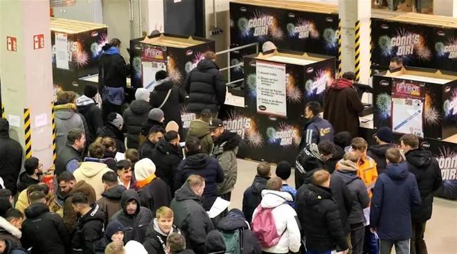 因此,几乎每年年末,欧洲都会出现抢购烟花的场景。而今年在德国,这样的抢购氛围似乎更加浓厚,当地出现排队购买烟花的场景。报道提到,在12月28日烟花开售首日,在德国下萨克森州梅彭地区,凌晨0时已经有烟花爱好者在超市外排队购买烟花。有博主称,12月28日早7时,他们来到超市时刚刚开门,店员还来不及上架和更新电子牌价格,第一波进店顾客已经将烟花“一扫而空”。视频显示,有人一口气抢购了1700欧元的烟花,有的超市开业不到1个小时,大部分烟花都宣告售罄。