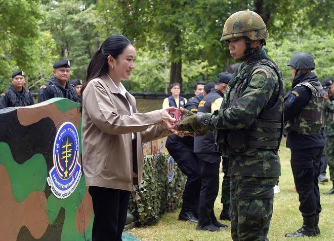 ▲当地时间2025年6月26日,泰国沙缴府亚兰县,泰国总理佩通坦在军事基地视察关闭的泰柬边境时,向泰国士兵分发干粮 图据视觉中国
