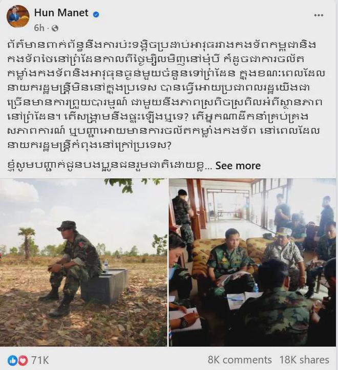 泰国、柬埔寨发生短暂交火以后,柬埔寨首相洪玛奈在社交媒体上发文说,“我希望柬泰两国陆军高层今天的会谈能够取得积极成果,一如既往地保持双方前线部队间的和平与良好沟通” 图:新华社援引洪玛奈社交媒体