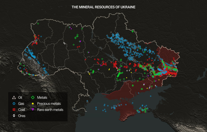 乌克兰有估值约12万亿美元的20种关键矿产资源,包括被广泛用于飞机和军舰的合金制造的钛(在欧洲储量排第一)、制造电动车电池不可或缺的锂(占欧洲储量的三分之一)以及美国完全依赖进口的石墨(占全球已知储量的20%)。乌克兰还拥有真正意义上的稀土元素(稀土不包括钛和锂),如铈、钇、镧、钕,虽然储量并不大。
