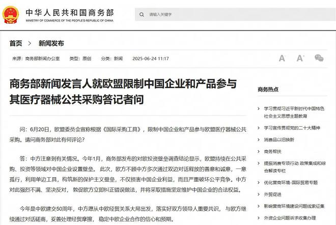 商务部新闻发言人表示,欧盟委员会于2025年6月20日出台措施,限制中国企业和产品参与其医疗器械公共采购,持续在公共采购领域对中国企业设置壁垒。中方多次通过双边对话表示,愿与欧方通过对话磋商和双边政府采购安排等方式妥处分歧。