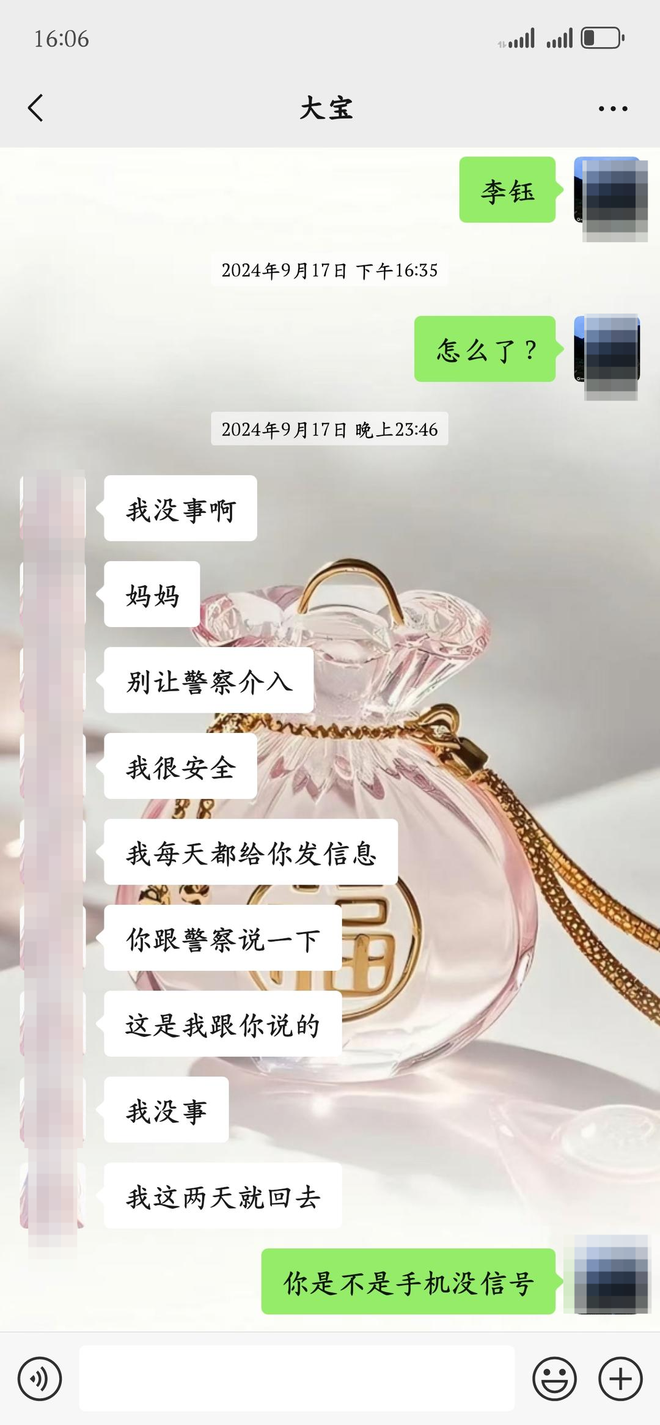 母女俩的对话显示,李女士每次问女儿什么时候回来,女儿的回答显得有些冷淡,“我知道”“知道了”,还多次提到“我还要钱”“钱没了可以再赚”等内容。同时,女儿还多次在微信上提醒李女士“不要报警”“我每天都给你发消息,你和警察说一下,我很安全,过几天就回去。”
