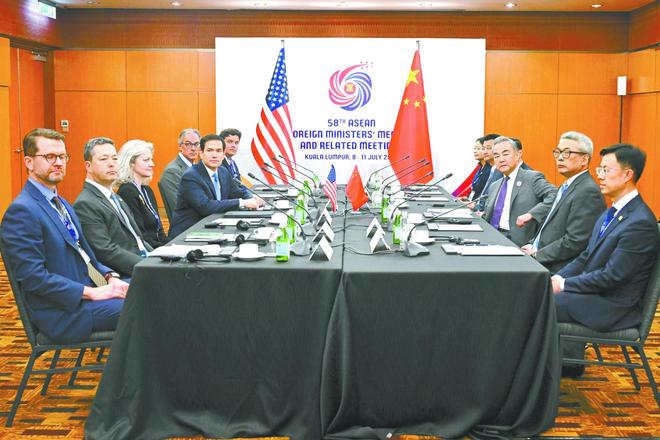 【环球时报综合报道】7月11日,在马来西亚吉隆坡出席东亚合作年度系列外长会期间,中共中央政治局委员、外交部长王毅会见美国国务卿鲁比奥。双方就中美关系以及共同关心的问题交换了意见,“一致认为会晤是积极、务实、建设性的”。国际媒体普遍表示,这是今年1月新一届美国政府上台以来,两国高层会谈之一,也是王毅与鲁比奥的首次面对面会晤,双方的积极对话将增加两国元首举行峰会的可能性,从而进一步缓和美中紧张关系。11日接受《环球时报》记者采访的专家表示,这次会晤有助于中美双方就当前面临的双边、多边、区域以及全球议题交流看法,认识彼此核心关切,对于美方更冷静、理性、务实处理涉华问题也会有积极作用。与此同时,按照路透社等媒体的说法,这是鲁比奥就任美国国务卿以来的首次亚洲之行,是美国将目光投向中东和欧洲冲突之外、重新聚焦印太地区的努力之一。但近期美国不断升级的关税威胁,以及对亚洲盟友日益增多的国防支出要求,给鲁比奥此次亚洲之行蒙上一层阴影。