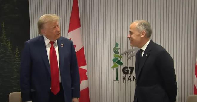 今年6月,特朗普在G7峰会上与加拿大总理卡尼会面(视频截图)