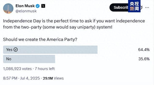 然而,他的抱负不止于此。7月5日,马斯克在自己掌控的社交平台上宣布成立“美国党”,声称将挑战美国共和党与民主党的两党制格局。