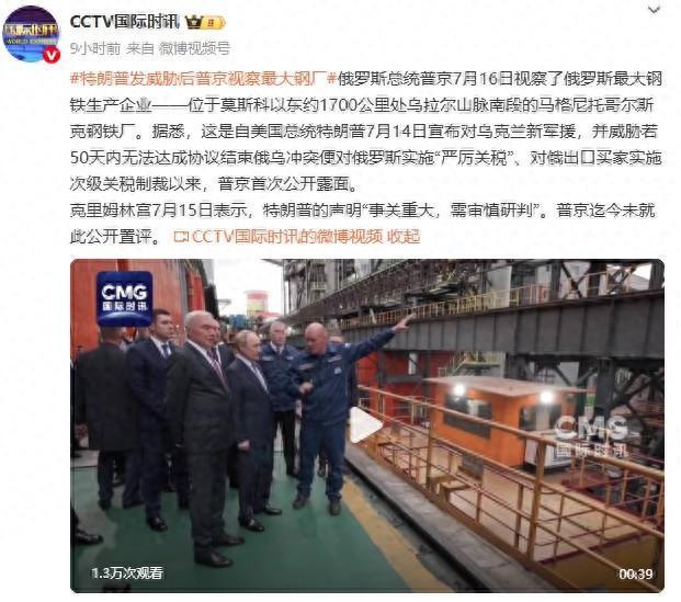 俄罗斯总统普京7月16日视察了俄罗斯最大钢铁生产企业——位于莫斯科以东约1700公里处乌拉尔山脉南段的马格尼托哥尔斯克钢... 俄罗斯总统普京7月16日视察了俄罗斯最大钢铁生产企业——位于莫斯科以东约1700公里处乌拉尔山脉南段的马格尼托哥尔斯克钢铁厂。据悉,这是自美国总统特朗普7月14日宣布对乌克兰新军援,并威胁若50天内无法达成协议结束俄乌冲突便对俄罗斯实施“严厉关税”、对俄出口买家实施次级关税制裁以来,普京首次公开露面。克里姆林宫7月15日表示,特朗普的声明“事关重大,需审慎研判”。普京迄今未就此公开置评。