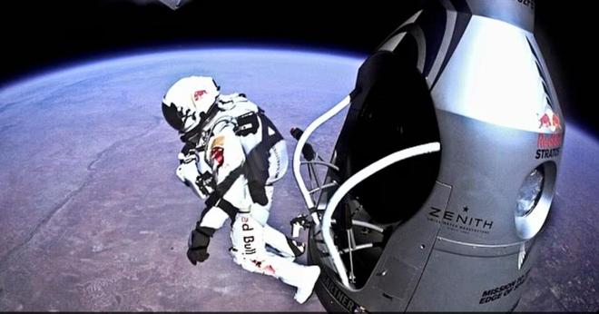 2012年10月14日,鲍姆加特纳向“人类生理与物理极限”发起的冲击。他乘坐氦气球携带的太空舱来到了39100米的高空,那里已经接近了平流层的顶端,空气稀薄,温度低至零下57℃。在打开舱门之后,鲍姆加特纳只留下一句“我现在回家”,便纵身跃下,仅用42秒就从0加速到达到了最高时速1357.6公里/小时,成功突破音障超越音速,成为人类史上首位在无机械助力下突破音障的人。