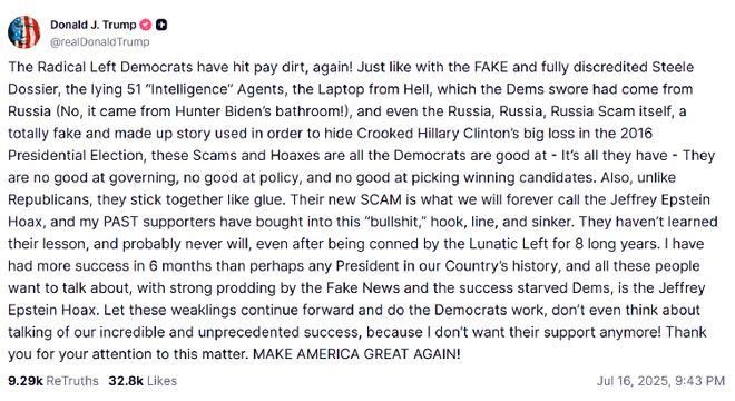 报道称,特朗普在帖文中主张“爱泼斯坦骗局”是民主党人炮制的谎言,“而我过去的支持者们已经完全相信了这个胡说八道”。特朗普愤怒地写道,“他们没有吸取教训,可能永远也不会吸取教训,即使被民主党人欺骗了8年之后。在假新闻和渴望成功的民主党人的强烈煽动下,这些人想要谈论的就是爱泼斯坦骗局”。英国《卫报》称,特朗普16日的帖文与他此前试图安抚支持者的举动截然不同。此前一天,他试图转移注意力,称关于爱泼斯坦的调查“无聊”,但表示支持公布任何“可信”的文件。