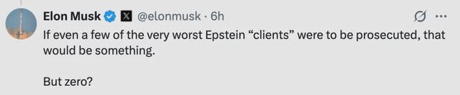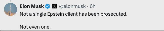 马斯克当天发布的其他帖文还包括,“哪怕在爱泼斯坦最恶劣的‘客户’中,只有几个被起诉,那也算是进展。但现在是零?”等等。
