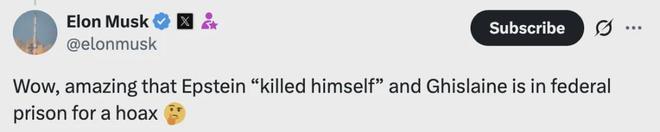 马斯克称“爱泼斯坦是‘自杀’,吉丝兰却因骗局被关进联邦监狱,这真是太神奇了” 图源:社交平台X