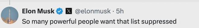 马斯克表示“太多有权势的人想把那份名单压下来” 图源:社交平台X