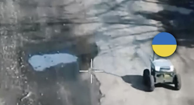 乌克兰第3独立突击旅发布的使用自杀式无人机和装载炸药的地面无人机作战车辆攻击俄军阵地的视频截图
