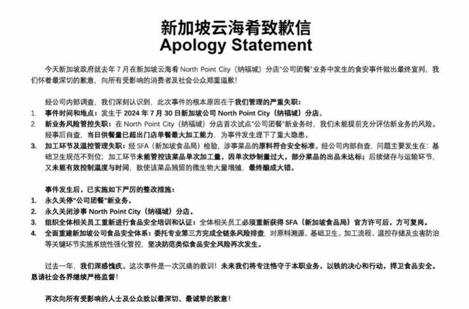新加坡云海肴公开发布致歉信