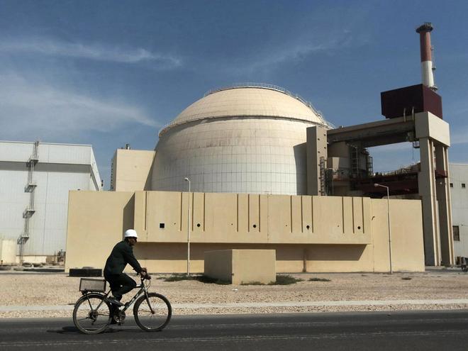 一名工人骑车路过伊朗布什尔核电站,该核电站是伊朗境内唯一运转的核电站(资料图)