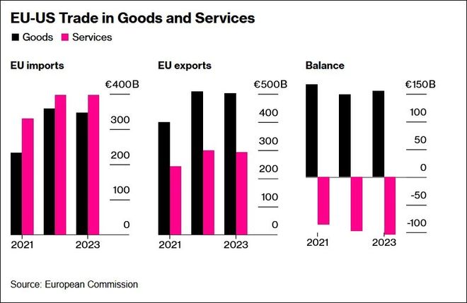 数据显示,美国对欧盟在货物贸易方面存在逆差,但在服务贸易方面实现顺差 彭博社制图