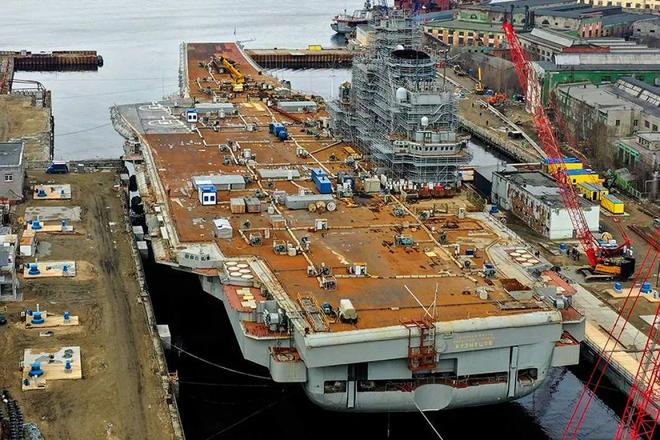 从地中海返航后,该舰被送往船厂进行维修和现代化改造。原计划于2022年完成维修并重新服役,但工期多次延误。2018年10月,浮动船坞沉没,船坞起重机砸中航母,导致舰体受损。2019年12月,舰上发生火灾:焊接作业产生的火花引燃了舱内残留的燃油。事故造成2人死亡,十余人受伤。2022年,该舰再次发生火灾,所幸无人伤亡。2023年,该舰水下部分的坞修工作完成。(编译/赵志鹏)