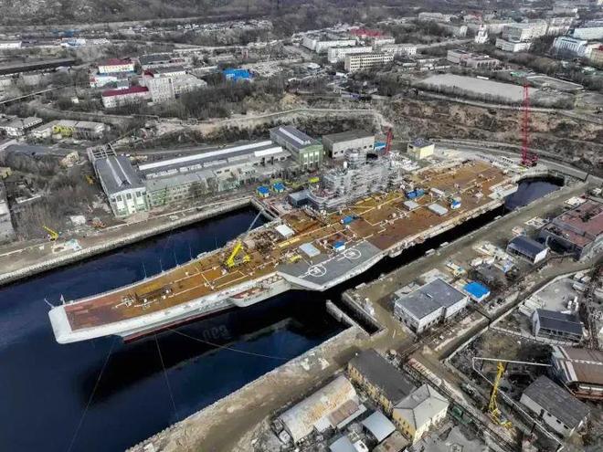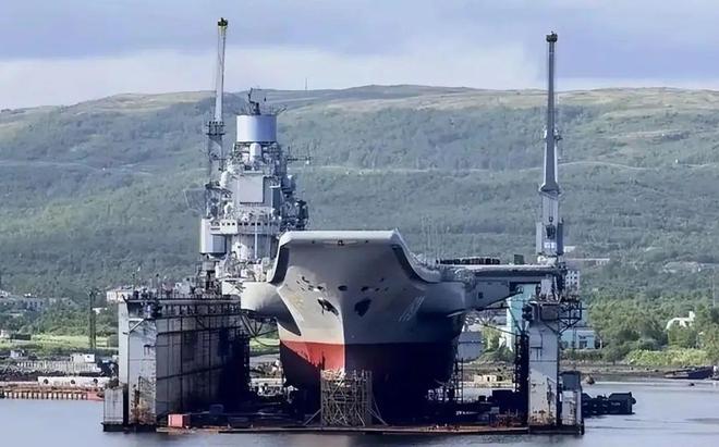 因此在结束叙利亚战事后,“库兹涅佐夫”号于当年10月开始进坞展开维修升级作业,计划全面翻新舰上设备后,继续服役20年——但此后8年过去了,它从来没能离开造船厂。先是2018年承担航母维修工作的浮动船坞沉没,船坞上的起重装置坠落时将航母甲板砸出一个直径约5米的洞,然后是2019年,这艘航母又发生了重大火灾,导致2人死亡,14人受伤。2022年底,该舰再次发生火灾,这些接连不断的事故导致原定完工时间从2022年一再推迟,尤其是俄乌冲突爆发后,俄军工拨款全面向前方战事倾斜,用于“库兹涅佐夫”号维修的经费严重不足。卫星照片显示,该航母的外观近年几乎没有明显变化,显示升级维修工作已经陷入停滞。