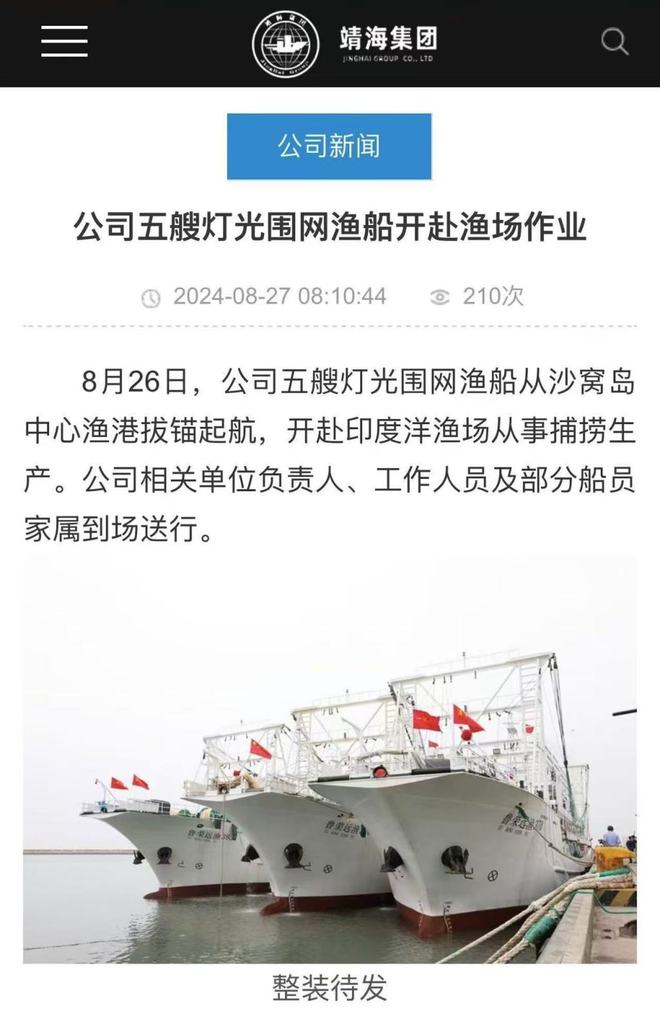 前述消息介绍,5艘渔船中有2艘是新建渔船,系首次开赴印度洋渔场作业。公司相关单位负责人、工作人员及部分船员家属到场送行。报道中配上了渔船整装待发和正式开赴渔船的照片,末尾称“预祝五艘渔船安全生产,捷报频传!”