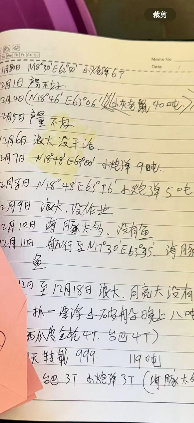 楚一军遗物中,还有一份航行日记,记录每日航行中的情况——“12月5日,产量不好”“12月6日,浪大没干活”“12月10日,海豚太多、没有鱼”“某日,抓(住)一漂浮小破船”……“从签合同开始,到人、目的地、时间、位置,又将航行面貌展现在我脑海里。”小星说。