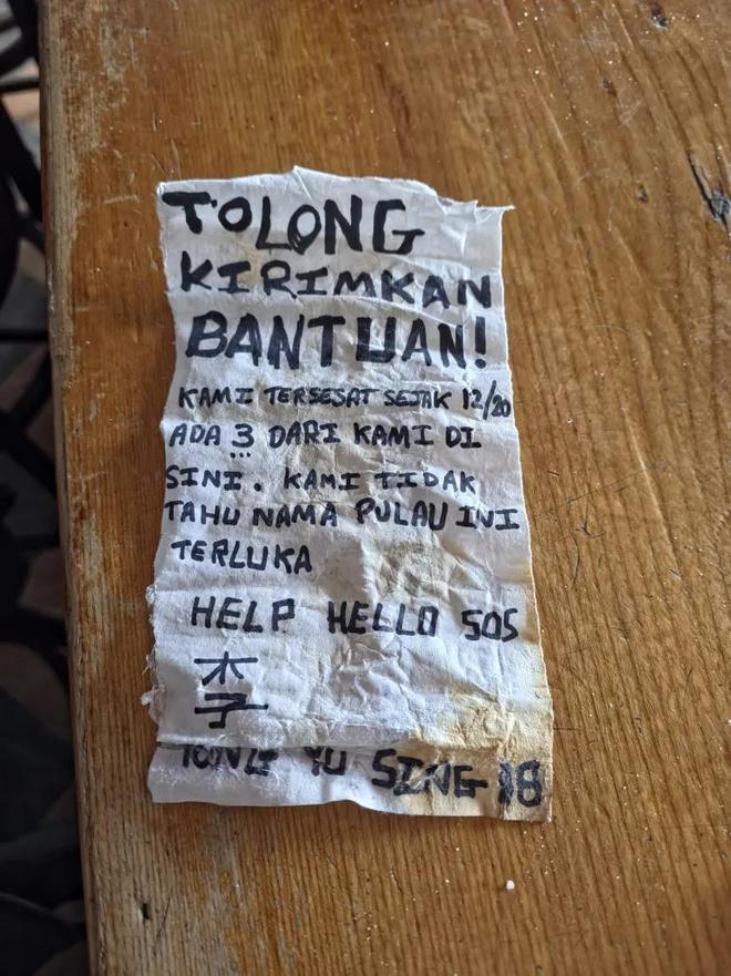 这张纸条是用印尼语手写的,部分内容是英文和中文。他们起初以为是恶作剧,便发在网上,很快有网友翻译出来:“请派人来救我们!我们从12月30日起就迷失在这里。我们有3个人。我们不知道这座岛的名字。我们受伤了。”