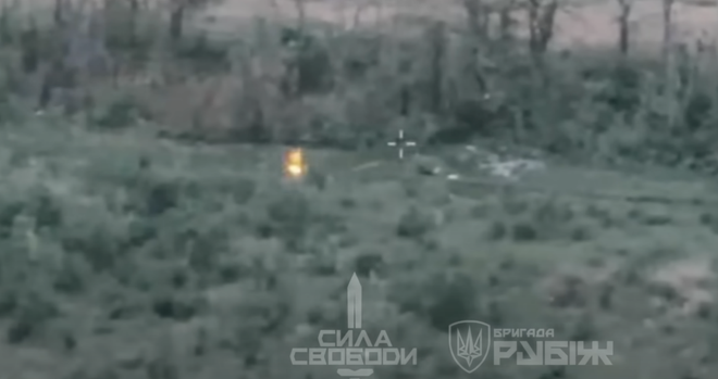乌方发布的视频显示,“坦克手”在拿到自行车前行仅几百码后触雷 图源:乌方发布视频截图