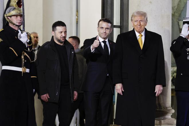 2024年12月7日,法国总统马克龙(左三)与美国当选总统特朗普(右)和乌克兰总统泽连斯基(左二)会晤后走出爱丽舍宫 新华社发(亨利·施瓦茨摄)