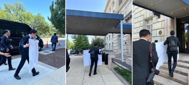 当地时间7月24日,位于华盛顿的美国商务部大楼前,韩国贸易谈判团队成员拿着用酒店桌布包裹的大型展示板,上面印有对打破韩美关税谈判僵局起到决定性作用的“MASGA”(“让美国造船业再次伟大”)项目的介绍材料 图源:韩媒