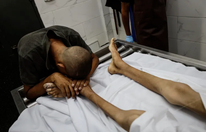 阿布哈特的父亲抚摸儿子的遗体加沙地带的饥荒正愈演愈烈,世界粮食计划署认定当地营养不良的状况已经达到惊人程度,加沙全境所有... 阿布哈特的父亲抚摸儿子的遗体
