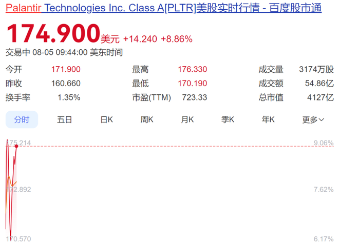 值得注意的是,Palantir盘初大涨8%,续创历史新高,总市值超过4000亿美元。Wedbush将Palantir目标价从160美元上调至200美元。