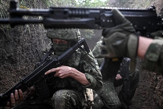 当地时间8月3日,库尔斯克地区,俄罗斯“北方”部队第34独立山地摩托化步兵旅的突击队士兵参加战斗训练