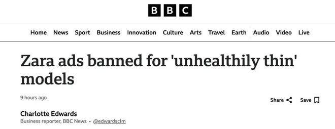 事实上,Zara并非今年唯一因此类问题被英国监管机构警告的品牌。BBC报道,7月英国老牌玛莎百货一则广告因模特“不健康的消瘦”形象被禁播,Next品牌的紧身牛仔裤广告也曾因模特身形问题被禁止投放。