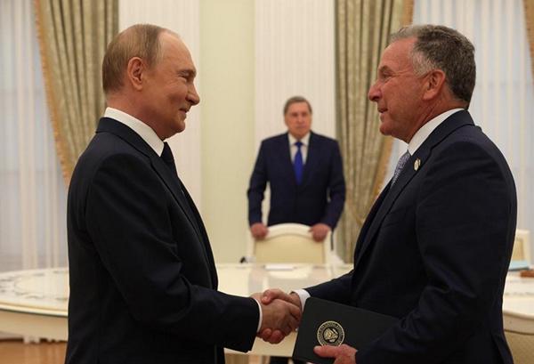 当地时间8月6日,普京(左)在克里姆林宫会见美国中东问题特使威特科夫 克里姆林宫网站