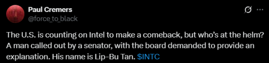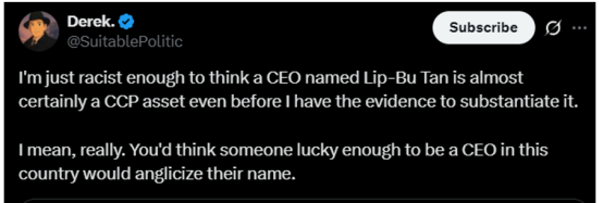 在美国的社交媒体X上,一些言论就在对陈立武的名字进行着“种族主义式的侮辱”。有人宣称,美国怎么可以让一个“Lip-Bu Tan”(注:陈立武名字英文拼写)来掌管英特尔这样重要的美国企业。还有人炒作阴谋论说,陈立武在美国做了这么多年企业,却一直没有给自己起一个纯粹的英文名字,说明他并不认同自己的美国人身份。