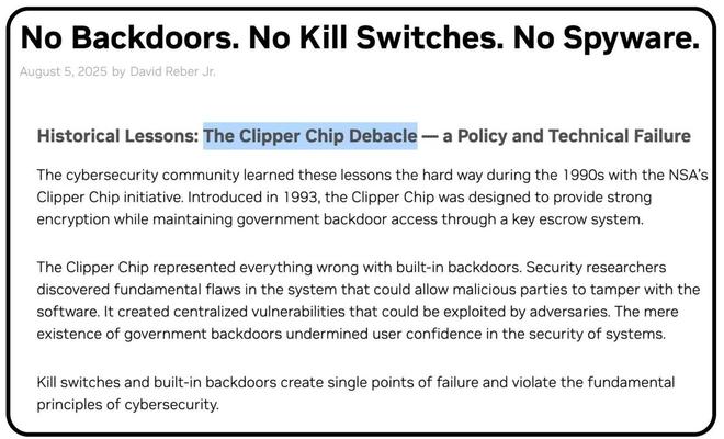 英伟达在随后的自辩声明中提到,芯片没有“后门”,他们还专门提到了“Clipper芯片”事件。
