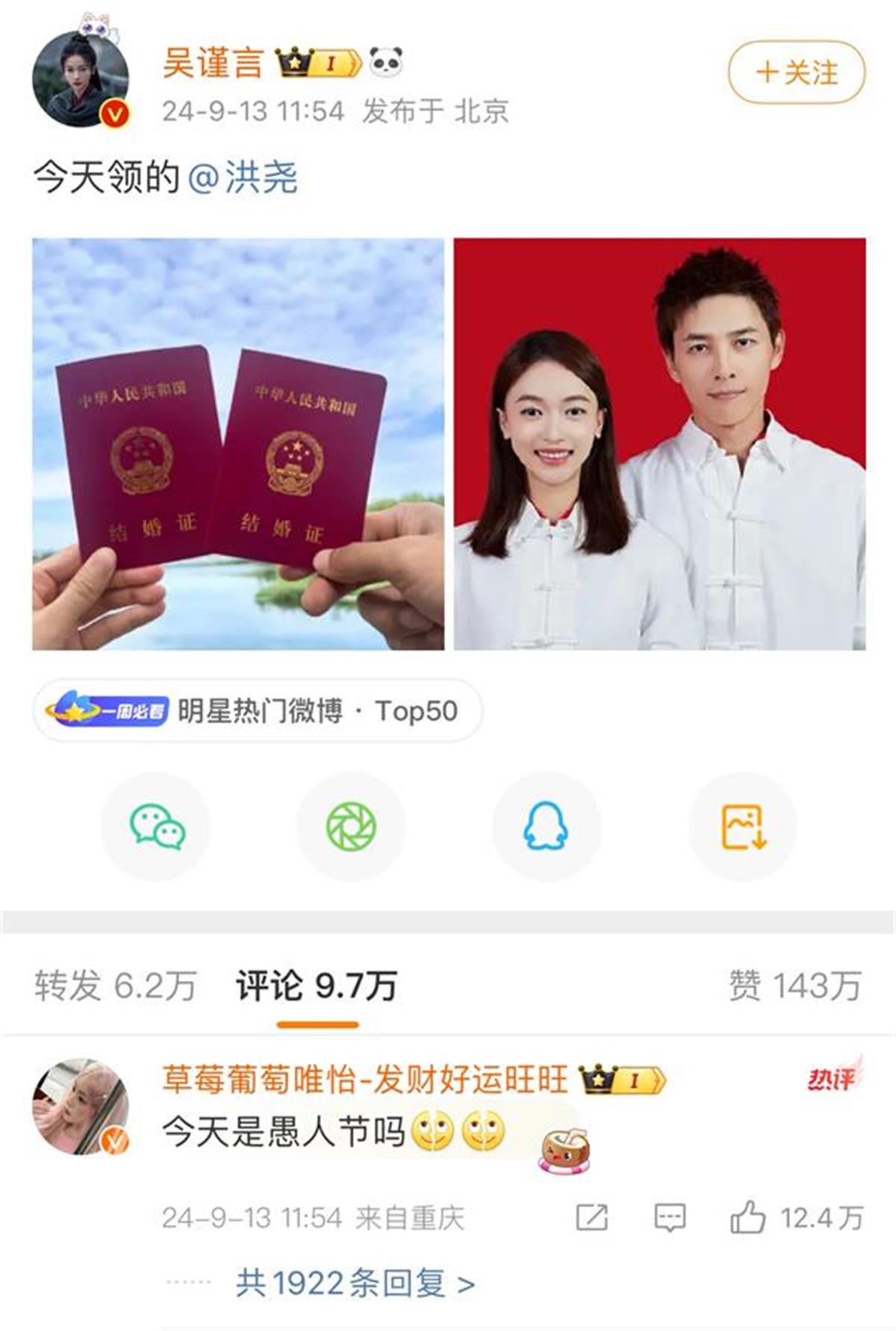 2024年9月13日11:54,凭借《墨雨云间》中“薛芳菲”一角再度翻红的吴谨言突然在微博晒出结婚证,表示“今天领的”,并艾特演员洪尧,对方同样晒出结婚证回应,“今天结的”。