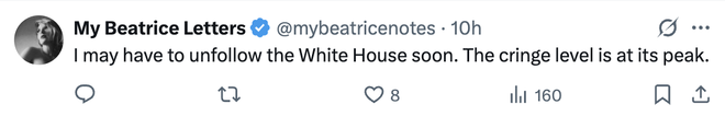 还有网友称要取关,“我可能很快就取关白宫了,尴尬到极点”。↓