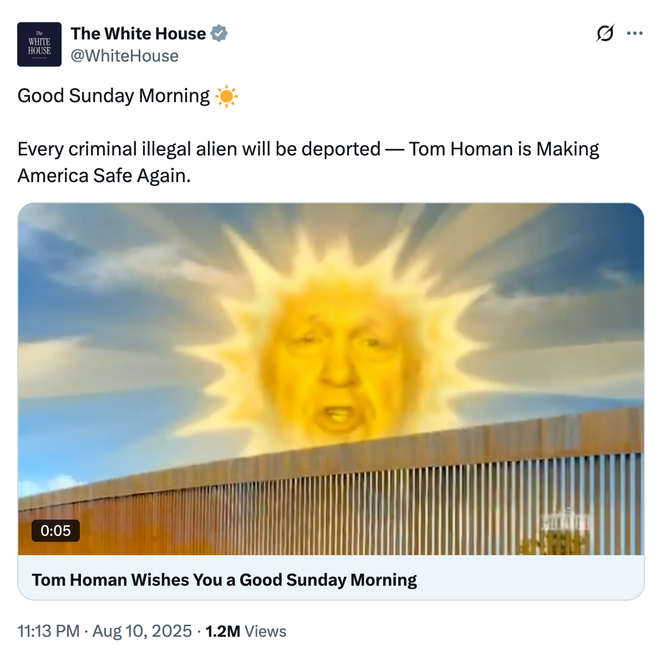 【环球网报道 记者 李飒】英国《镜报》美国版报道称,美国白宫官方账号当地时间10日发布一条“早安”视频引发争议:相关画面似乎借用《天线宝宝》素材,其中“太阳宝宝”的脸被替换成了美国白宫边境事务主管汤姆·霍曼,白宫借此喊话称要驱逐非法移民。对此,英国《每日星报》则用“诡异”来形容这一片段。