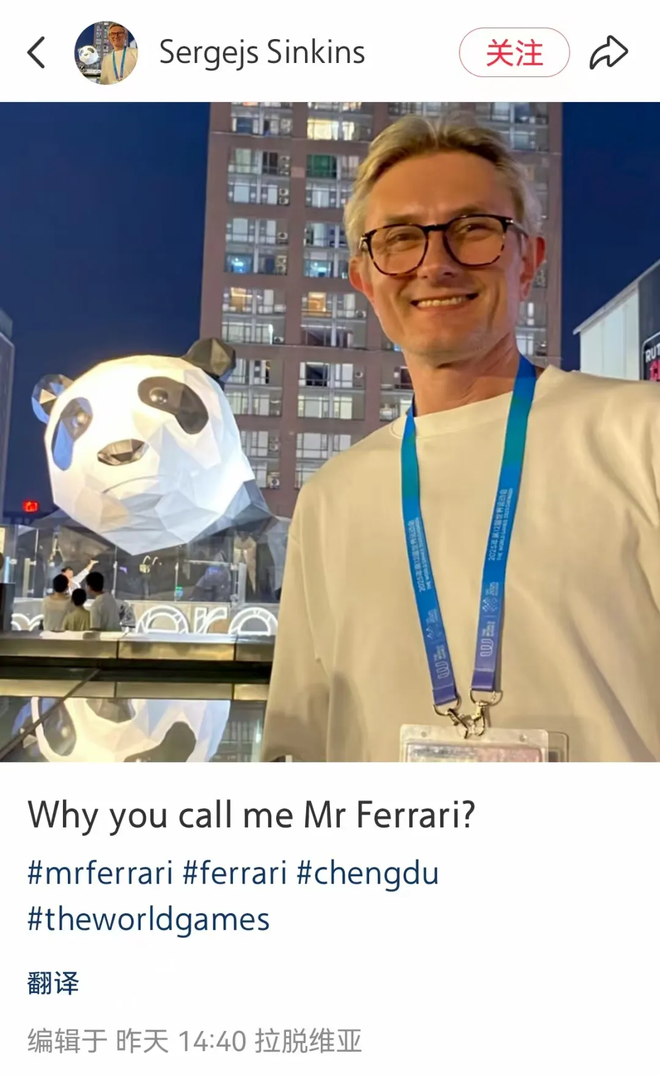 感受到中国网友的热情和友好,辛金斯在中国社交媒体上注册了账号,并在8月10日发帖询问“为什么叫我‘法拉利’?”