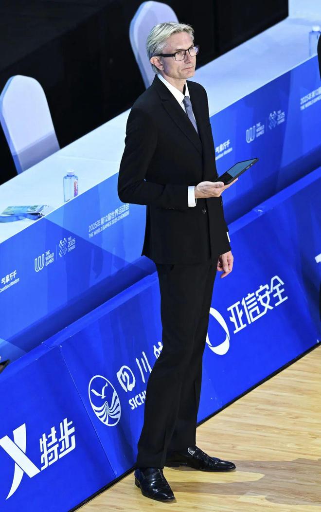 时间回到8月8日下午,成都城北体育馆的拉丁舞半决赛正在进行。当镜头扫过裁判席时,观众席突然响起一阵低低的惊叹——画面中央,一位金发男子正低头在评分表上记录,笔挺的黑色西装将肩背线条勾勒得如同古希腊雕塑,两条长腿在裁判椅后形成流畅的斜线。