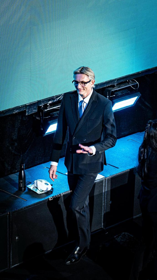 更绝的是他的动态魅力——当选手跳至伦巴段落时,他会不自觉跟着音乐轻晃指尖,喉结随节奏微滚动;打分时抬笔的瞬间,手腕翻转的弧度都透着舞者的韵律感,被调侃“明明是来工作的,却像在走隐形T台”。
