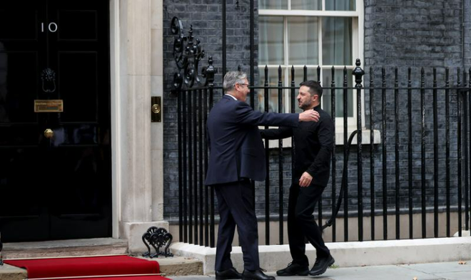 8月14日,在英国伦敦唐宁街10号首相府前,英国首相斯塔默(左)迎接乌克兰总统泽连斯基。当日,英国首相斯塔默在伦敦会见乌克兰总统泽连斯基。 新华社记者 李颖 摄