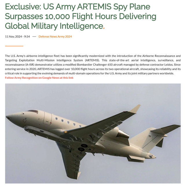但类似麦塔公司这样的美国私营防务承包商,为美军在南海等中国周边地区执行侦察任务的确不是第一次了。老司机注意到,美国陆军在去年年底专门庆祝了“机载侦察与目标多任务情报系统”(ARTEMIS)完成了超过1万飞行小时的侦察飞行任务。所谓ARTEMIS,其实就是另一家美国私营防务承包商——拉塞公司改装的庞巴迪“挑战者650”公务机,通过增加大量电子侦察设备,它成为了能够在复杂作战环境中收集和分析各种电子信号和数据的先进空中情报收集平台,能够满足美国陆军对高速、远程情报、监视和侦察能力日益增长的需求。