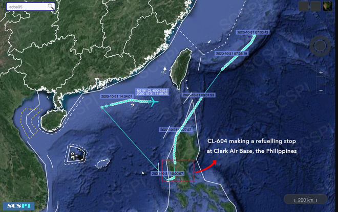此外,另一家美国私营防务承包商特纳克斯航空航天公司的特种飞机也是南海的“常客”。该公司改装的庞巴迪CL-604海上监视飞机可以视为简化版P-8A反潜巡逻机,具备海上多目标跟踪监视和侦察能力。“南海战略态势感知”平台的统计数据显示,仅在2020年4月到11月,该机就前往东海、黄海及台湾海峡北口地区开展侦察行动139架次,前往南海开展侦察行动17架次。其中该机在南海侦察期间,通常还会选择在菲律宾降落加油。