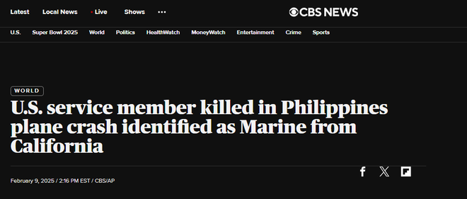美国哥伦比亚广播公司网站9日称,美国海军陆战队官员在声明中证实了遇难的海军陆战队士兵的身份:22岁的雅各布·达勒姆中士。当时美国军方承包的一架由“空中国王”比奇350小型飞机改装而来的侦察机正在执行“例行任务”,“应菲律宾盟友的要求提供情报、监视和侦察支持”。达勒姆接受过电子情报/电磁战分析师的培训,隶属海军陆战队第一远征军信息组第1无线电营。