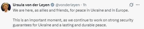 当天晚些时候,欧盟委员会主席冯德莱恩在社交媒体上表示,欧洲将继续努力为乌克兰提供强有力的安全保障,并实现持久的和平。