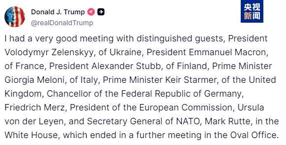 当地时间18日,特朗普在社交媒体上表示,在白宫会议上,他与欧洲领导人讨论了对乌克兰的安全保证,这些保证将由欧洲各国在与美国的协调下提供。