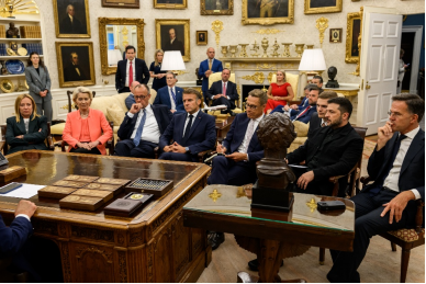 晚些时候,特朗普在白宫与到访的欧洲领导人举行多边会晤。除特朗普与泽连斯基外,与会者包括欧盟委员会主席冯德莱恩、法国总统马克龙、德国总理默茨、英国首相斯塔默、意大利总理梅洛尼、芬兰总统斯图布以及北约秘书长吕特。