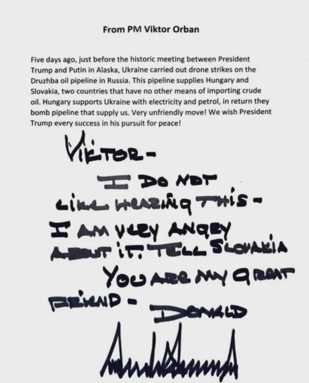 欧尔班勃然大怒,8月22日公布了他向特朗普的“告状信”。信中说,“友谊”输油管道对匈牙利和斯洛伐克极为重要,他对乌克兰袭击很不满。