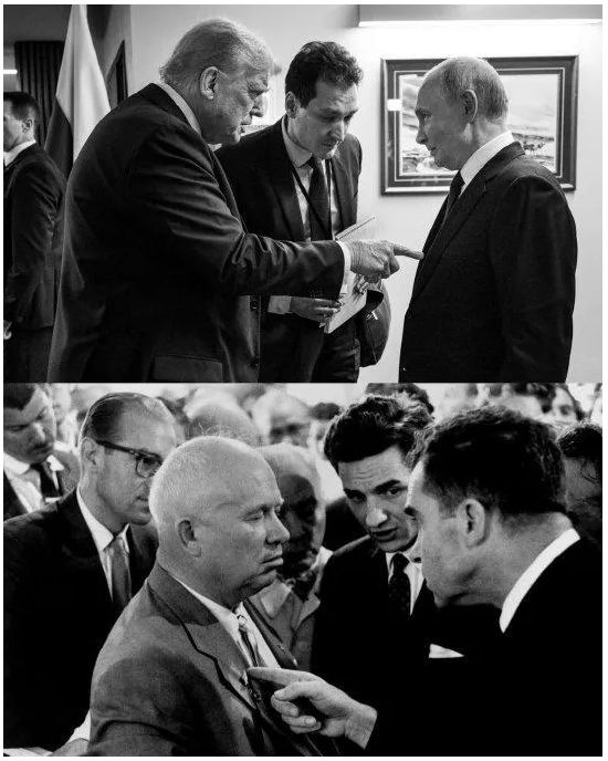 特朗普应该是拿过来做对比。所以,他放的另一张图片,就是在阿拉斯加会晤中,他同样右手食指指向普京的照片。